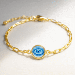 Pulsera de plata esterlina 925 con recubrimiento en oro amarillo 18k con diseño de eslabones rectangulares de 19cm y una medalla de ojo protector azul.