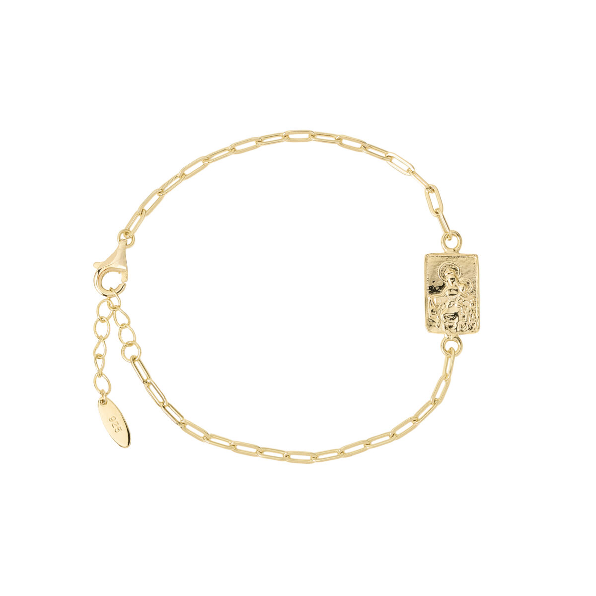 Pulsera de plata esterlina con recubrimiento de oro amarillo 18k de eslabones con placa rectangular escapulario con virgen y Sagrado Corazón. 18cm de largo.