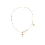Pulsera de oro amarillo 18k  denario con delicadas cuentas intercaladas, una cruz colgante y una medalla religiosa. Un diseño clásico y elegante que simboliza fe, amor y protección, ideal para regalar en momentos especiales.