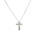 Collar de oro blanco 18k con cadena de cuentas  y un colgante de cruz mini de 11x 7mm con diamantes en corte brillante 0.30ct en total. Largo 45cm