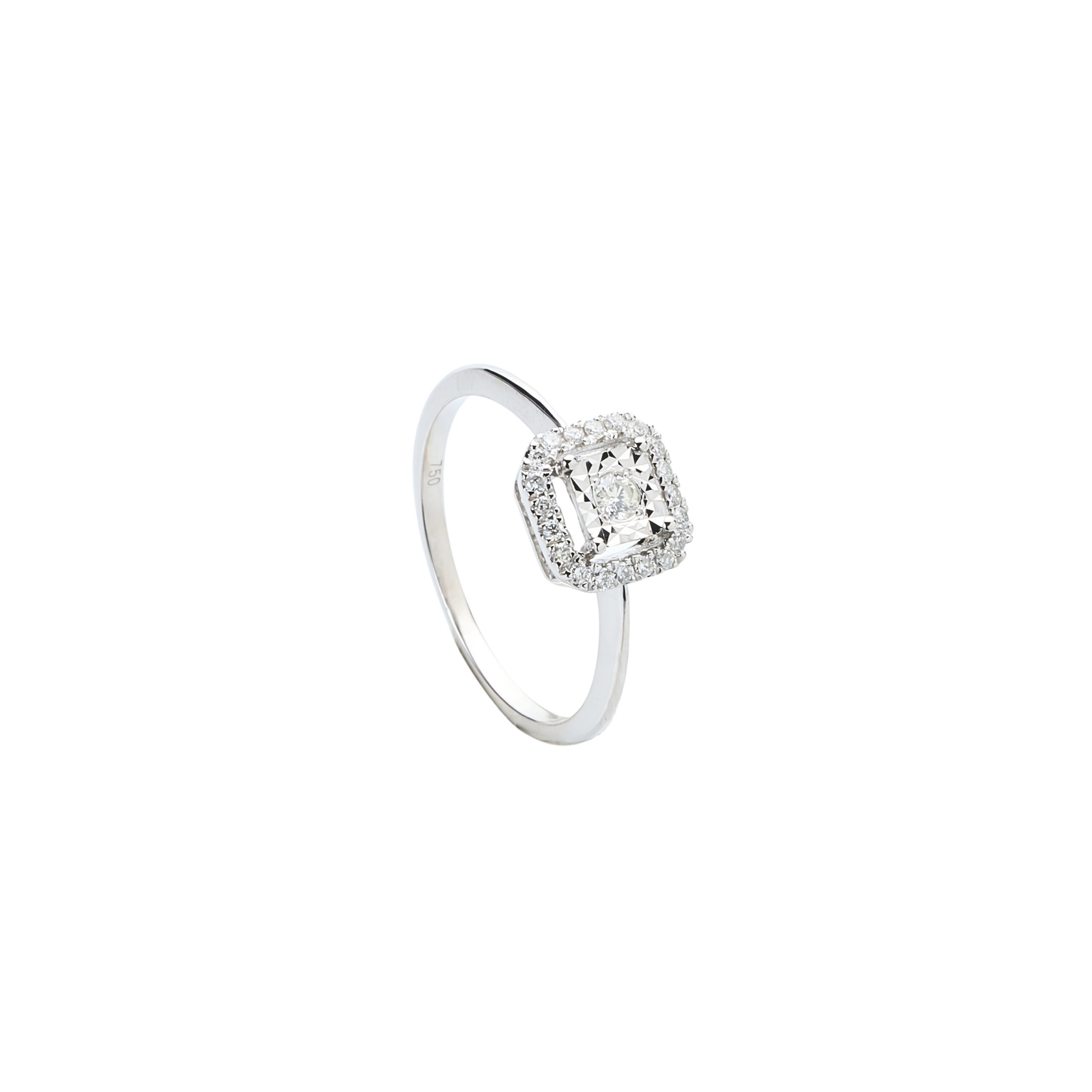 Anillo Solitario de Oro Blanco 18k con un diamante corte brillante en el centro con un Bisel en oro diamantados en forma cuadrada y halo de brillantes. Talla 11