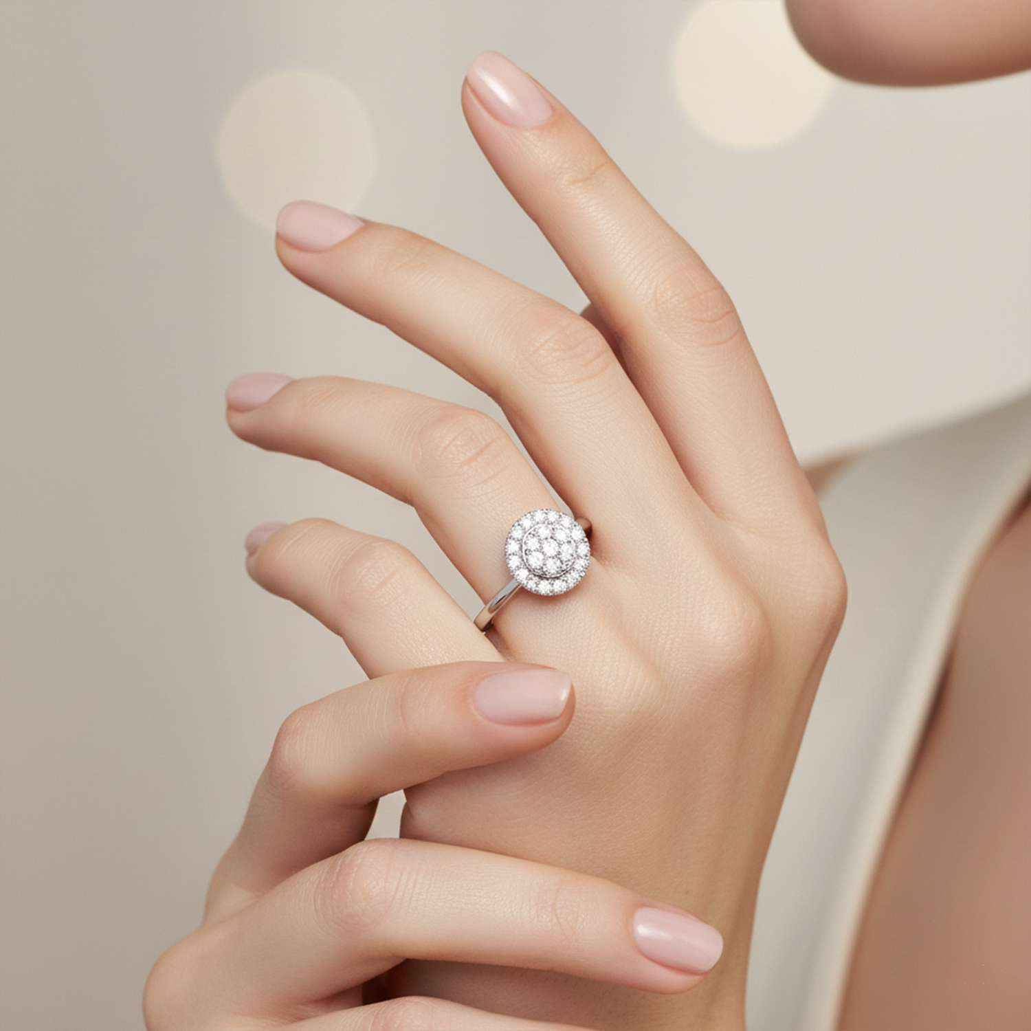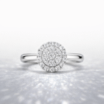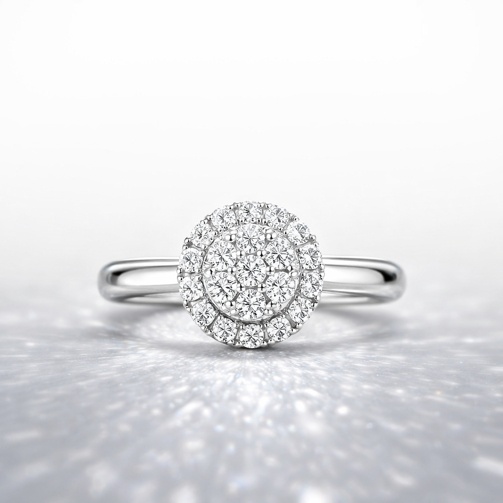 Anillo de Oro Blanco 18k con diamantes en corte brillante engastados en un circulo estilo sofia, 22 diamantes, en total 0.31ct Talla 10
