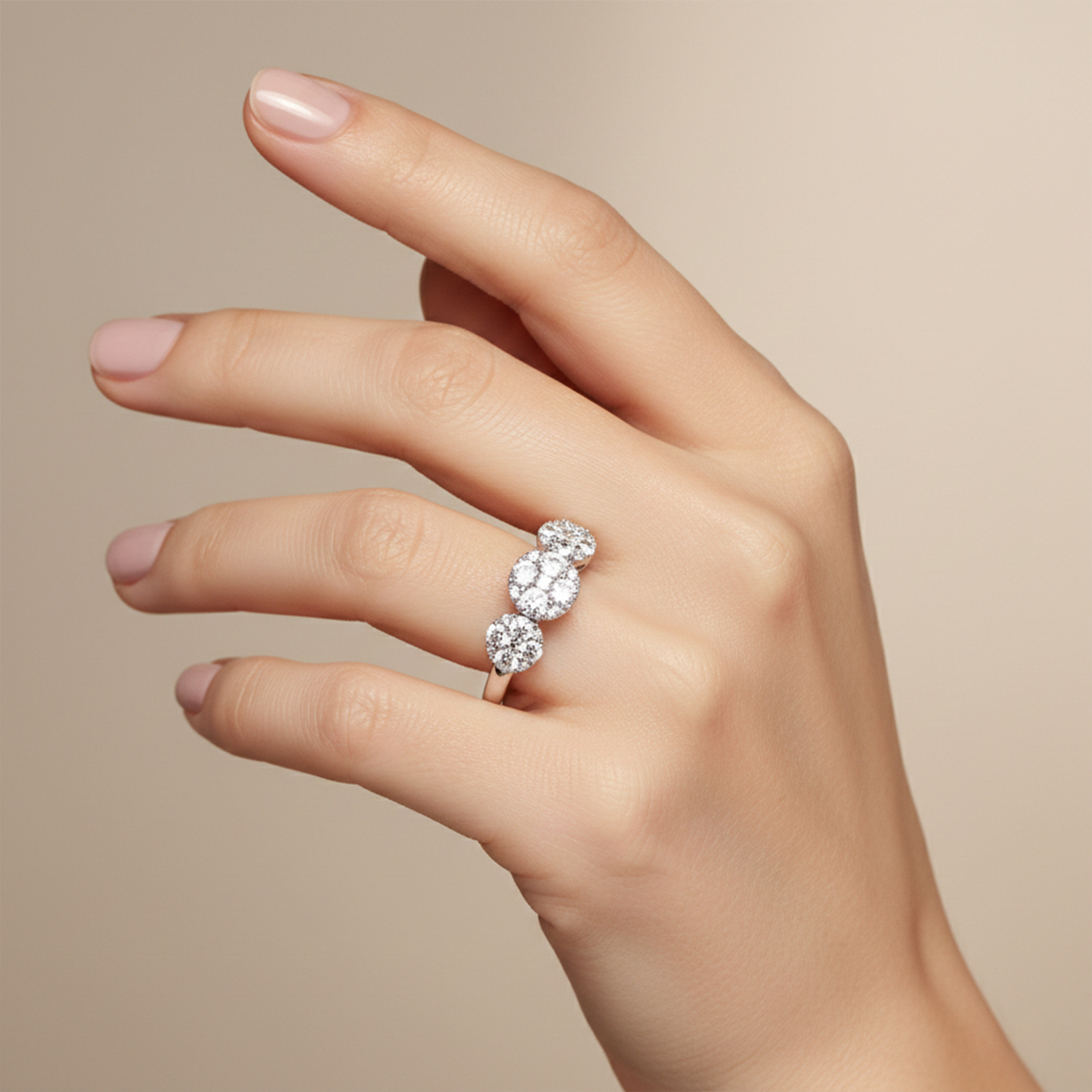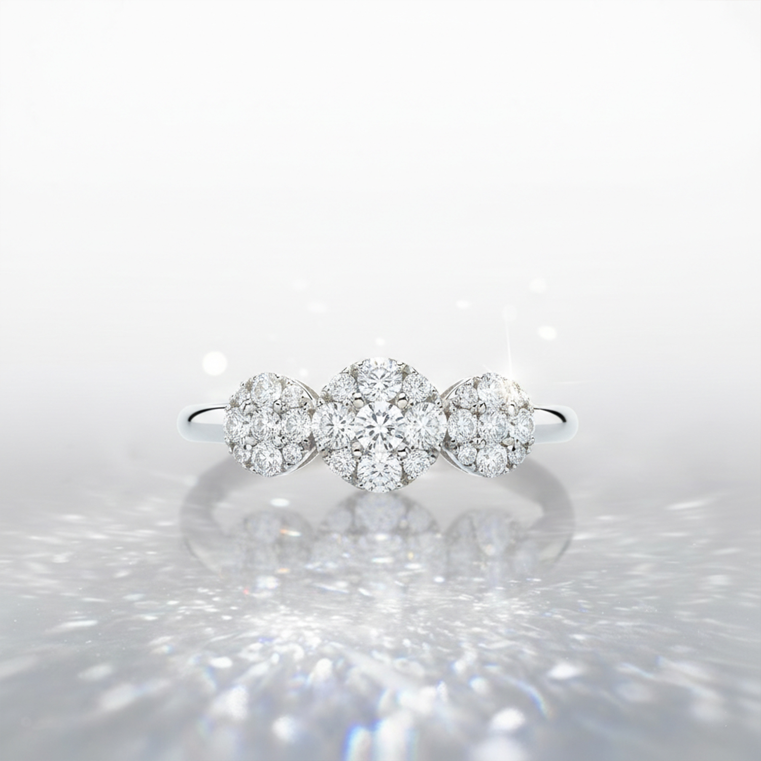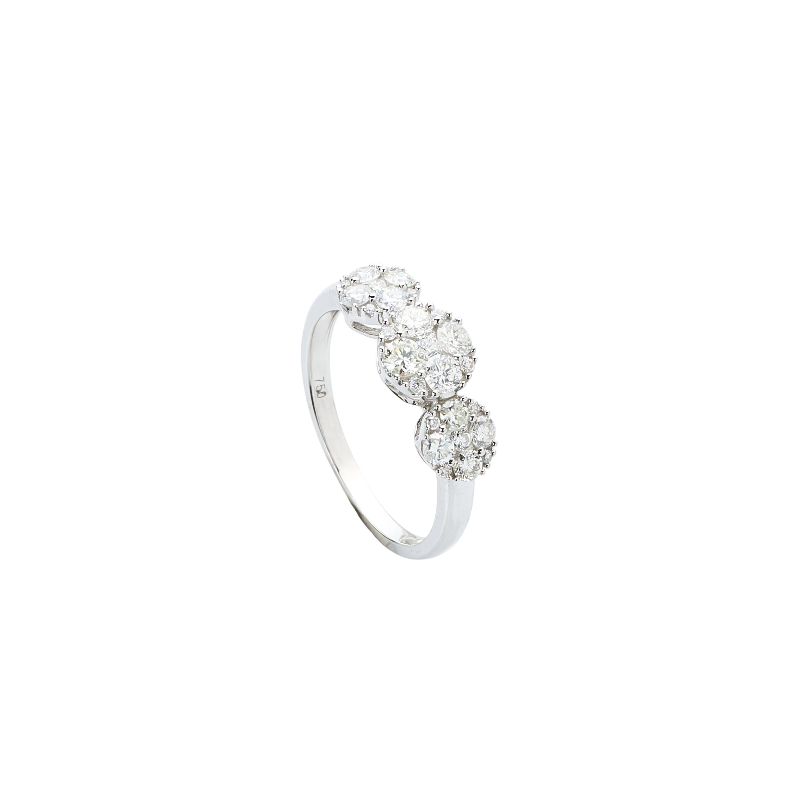 Anillo de Oro Blanco 18k con diamantes en corte brillante engastados en grifas en tres círculos Sofias. 0.72ct en talla 13.